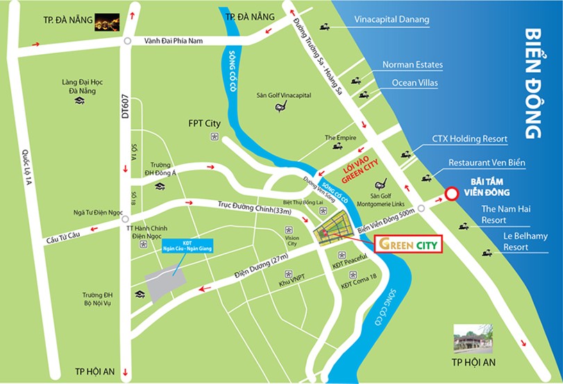 Dự án Khu Đô Thị Green City tọa lạc vị trí rất độc đáo nằm trên mặt tiền Sông Cổ Cò, đối diện qua sân Golf Montgomerie Links – được Forbes bình chọn là 1 trong 10 sân Golf hàng đầu Châu Á, chỉ cách khu du lịch biển 500m, bao quanh là các Resort 5* hình thành một cộng đồng sống văn minh – đẳng cấp.